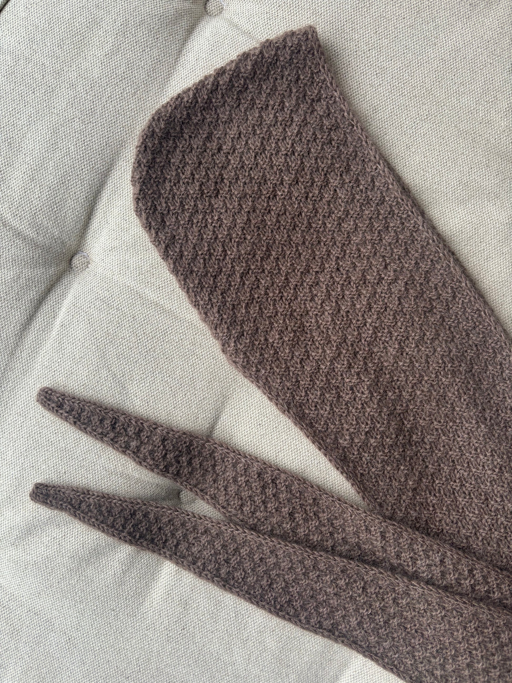 The Amelia Hood is a hooded scarf worked back and forth in double moss stitch with i-cord edges. The two sides of the scarf are worked separately and then joined to create the hood. There are no seams – it’s worked all in one piece.