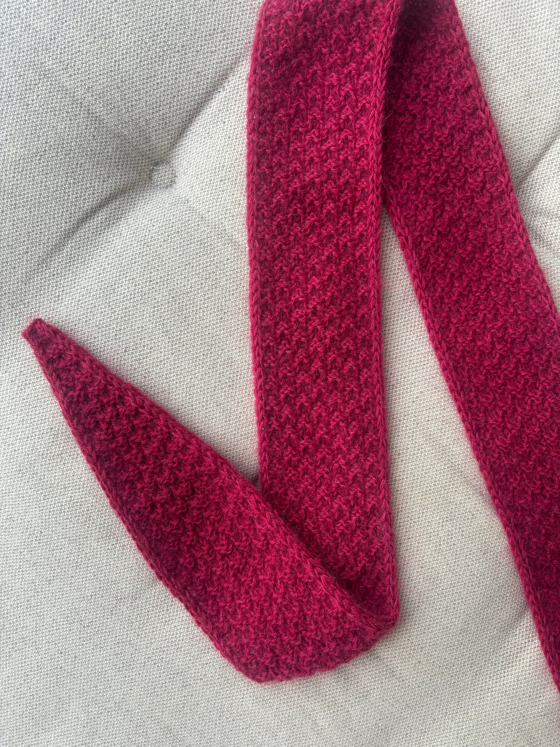 Amelia Scarf is worked flat from tip to tip in double moss stitch with i-cord edges. The simple, repetitive stitch pattern makes this a beginner-friendly project that knits up quickly.