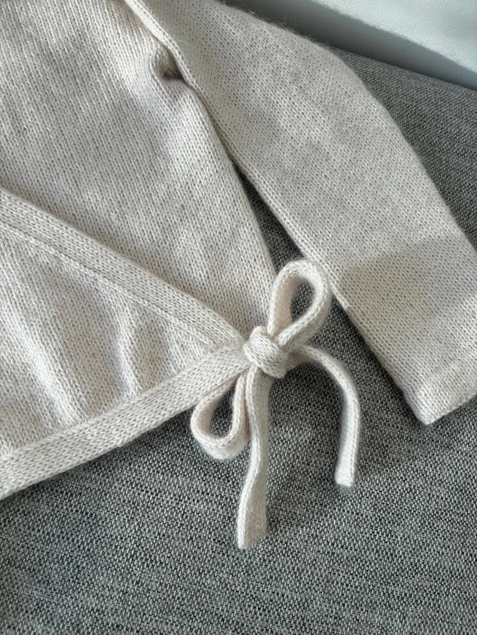 The Aria Wrap Cardigan is a wrap cardigan with side ties. It is worked from the top down. The cardigan features a deep V-neck, double-knitted edges, and tie bands.
