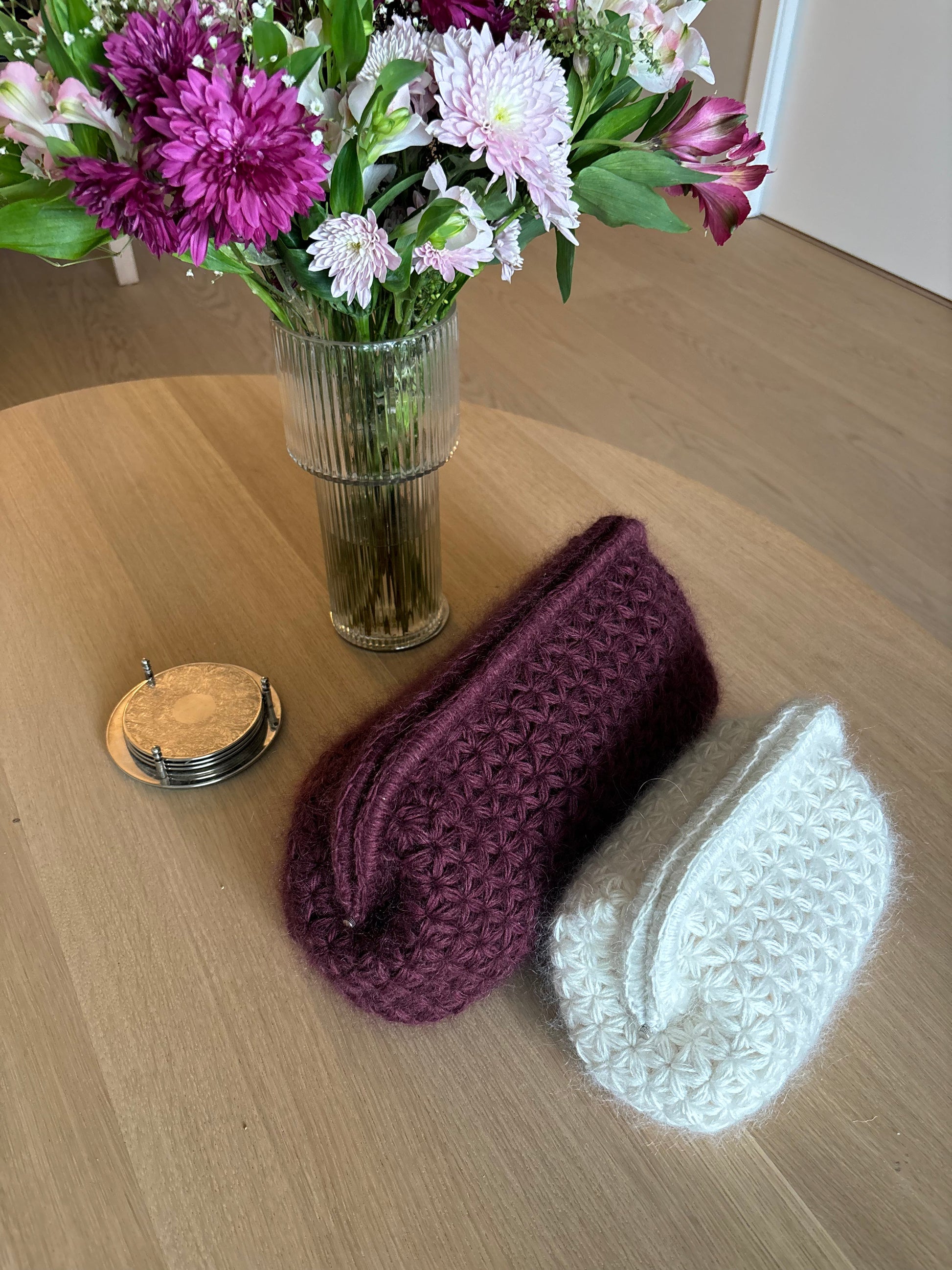 The Daisy Clutch comes in two different sizes. The clutch is both practical and decorative - the small size is perfect as a makeup bag, a small purse, or for keeping track of small items and crochet accessories. The large one holds surprisingly much and can be used as a handbag or toiletry bag.