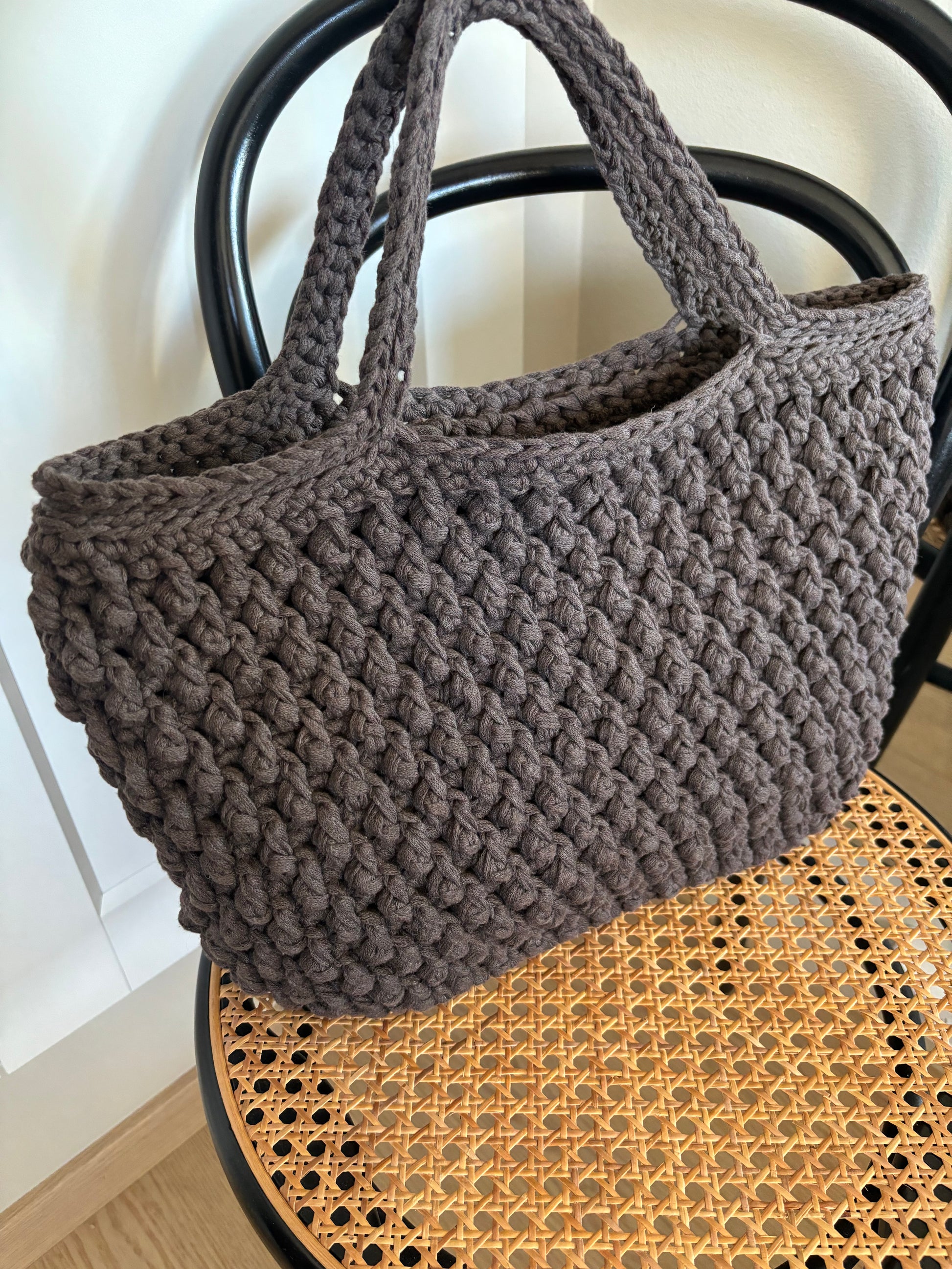 YARN SUGGESTIONS: 3 skeins Hooked Ribbon XL (250 g = 120 m) (shown in the color Tobacco Brown) or Svarta Fåret Ribbon (250 g = 130 m) or Friends Ribbon (250 g = 125 m) or Hobbii Ribbon (250 g = 125 m) or Mayflower Ribbon (250 g = 125 m)